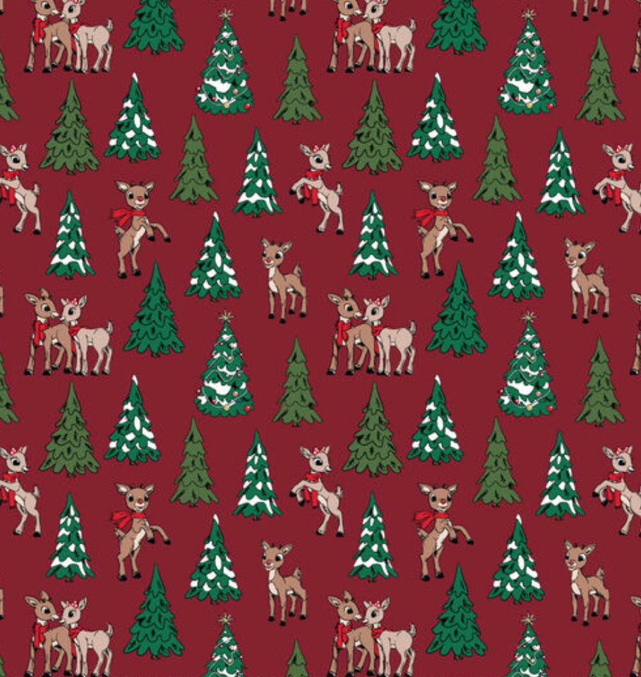 "She thinks I'm CUUUTE" Aw, Rudolph and Clarice on burgundy background.