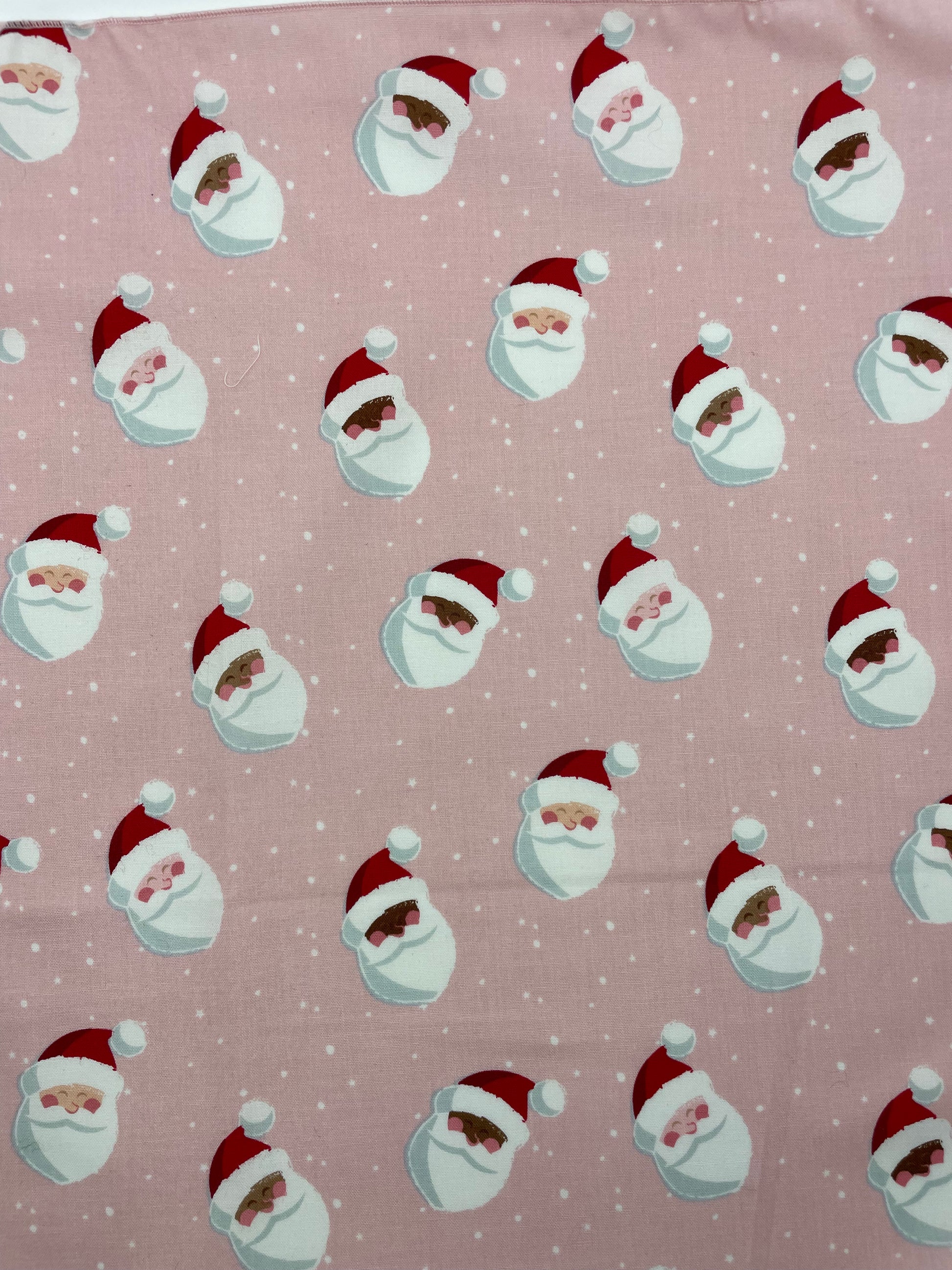 Santas of all colors adorn this pretty pink background.